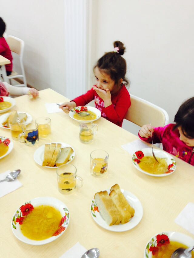 Посторная и светлая, наполненная заботой кухонных работников, столовая каждый раз с нетерпением ждет встречи с детьми.