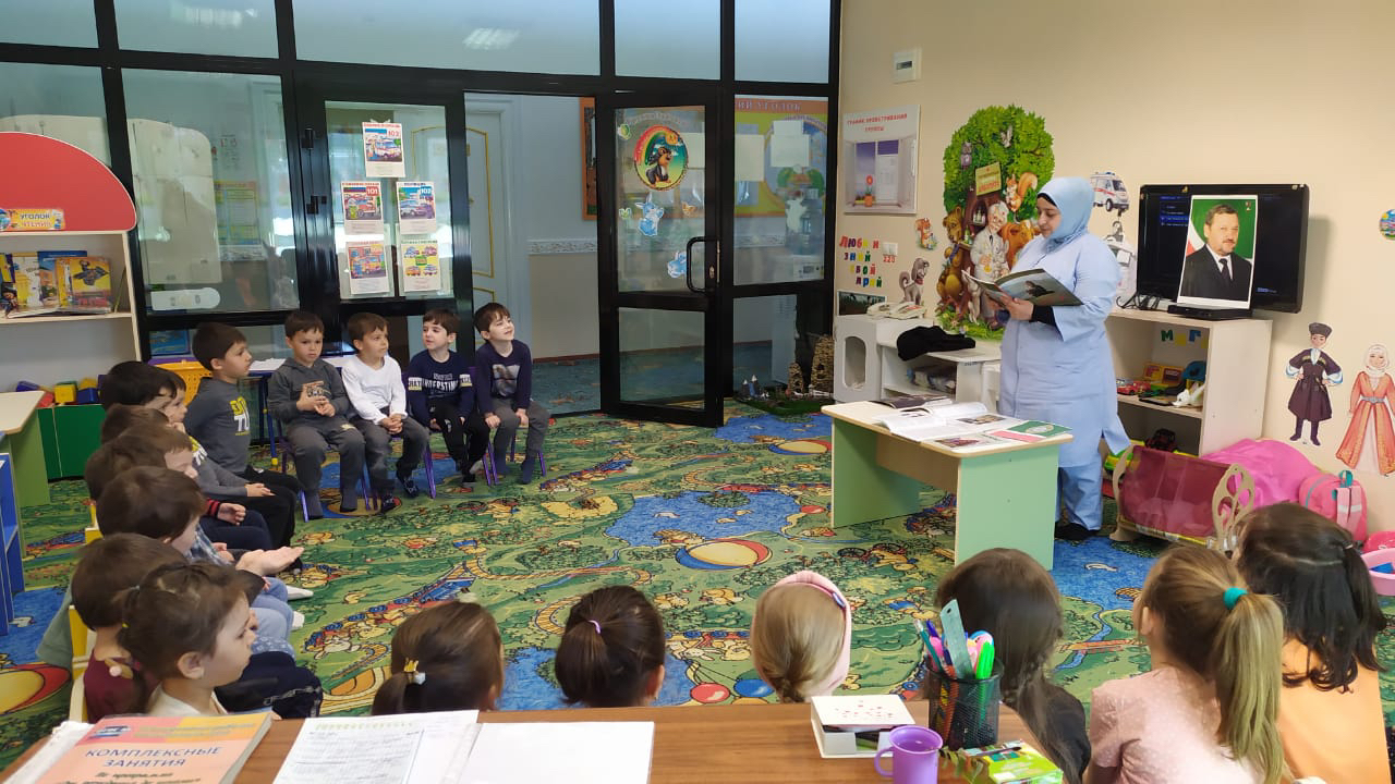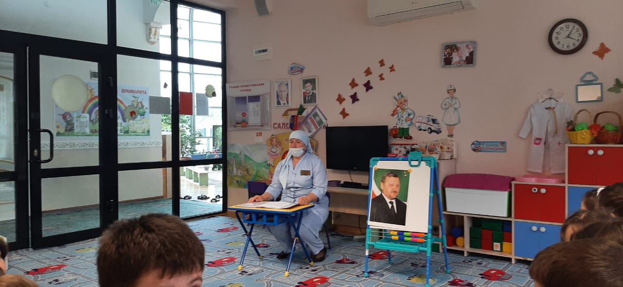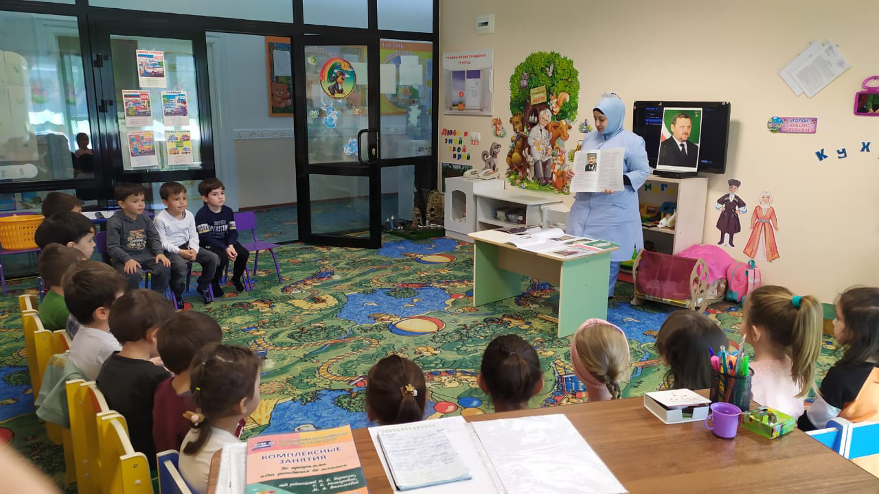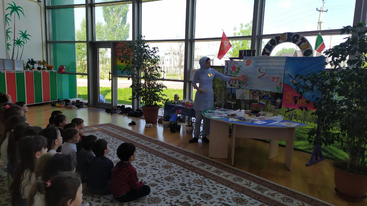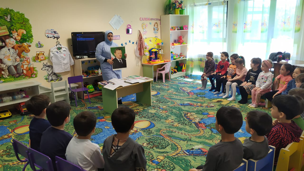 В старших группах проведены тематические беседы на тему: «10 мая -День памяти и скорби чеченского народа». В этот день вспоминают тех, кто отдал свою жизнь за наши надежды и мечты. Мирное небо хранит подвиги и имена героев, которые навечно вписаны в историю Чеченской Республики. В нашем ДОУ провели тематические беседы посвященные Дню памяти о Первом Президенте Герое России А.-Х. Кадырове, где говорилось о том, как он пожертвовал своей жизнью, ради процветания и возрождения Чеченской Республики. Жизнь первого президента, отданная во имя свободы, принесла мир и спокойствия на чеченскую землю. Он всегда был, есть и будет Народным Героем России. Его поступки навечно останутся в сердцах народа. Фасад здания был оформлен баннером, также в группах были вывешены стенды и газеты, посвященные Первому Президенту А.-Х. Кадырову.